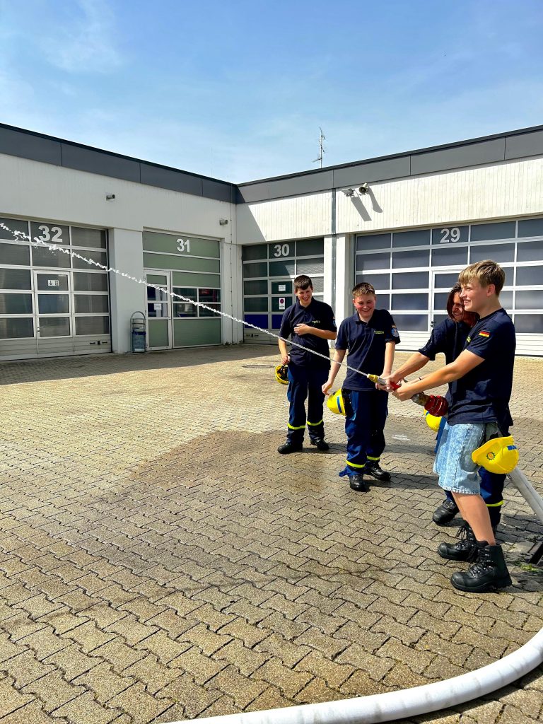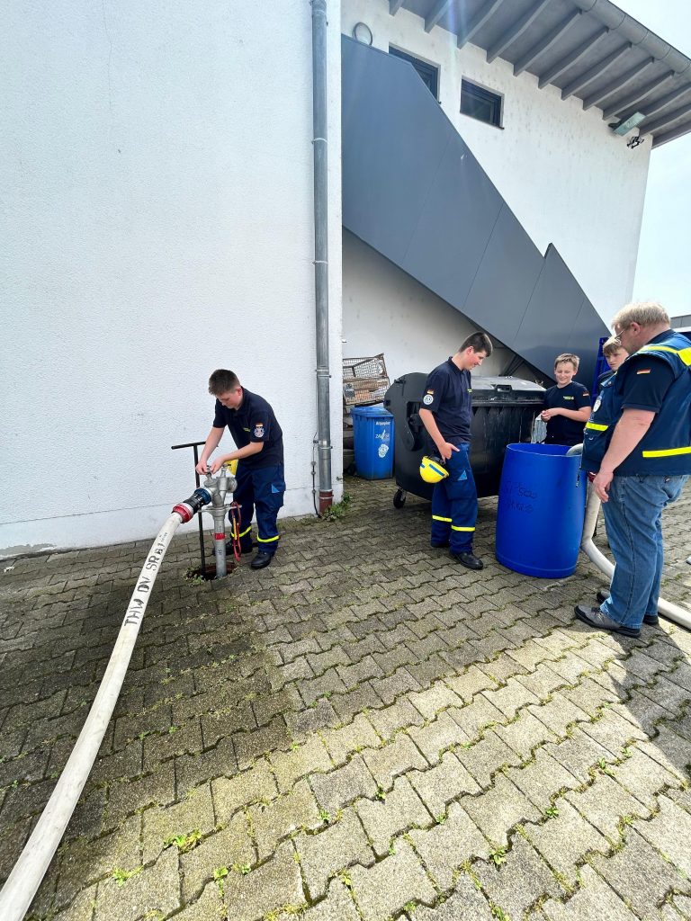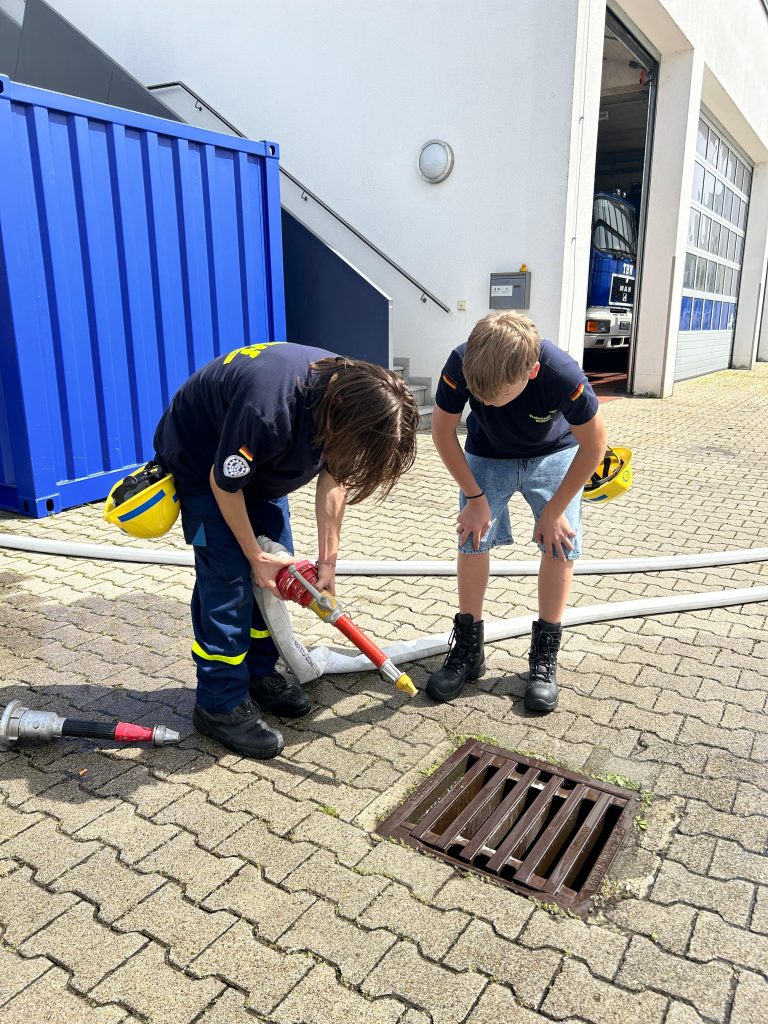 Anschließend demonstrierten wir die Einrichtung der Wasserversorgung: Das Öffnen des Unterflurhydranten, das Einsetzen des Standrohrs, das Aufdrehen des Hydranten sowie das Ausrollen und Verbinden der Schläuche. Schließlich erklärten wir den korrekten Anschluss des Strahlrohrs und die Aktivierung der Tauchpumpe, um das System in Betrieb zu setzen. Die Jugendlichen konnten so die Bedeutung und Zusammenarbeit aller Komponenten im praktischen Einsatz erleben.